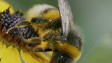 A bee flies from flower to flower, taking pollen with it. This helps flowers, fruits, and vegetables grow.